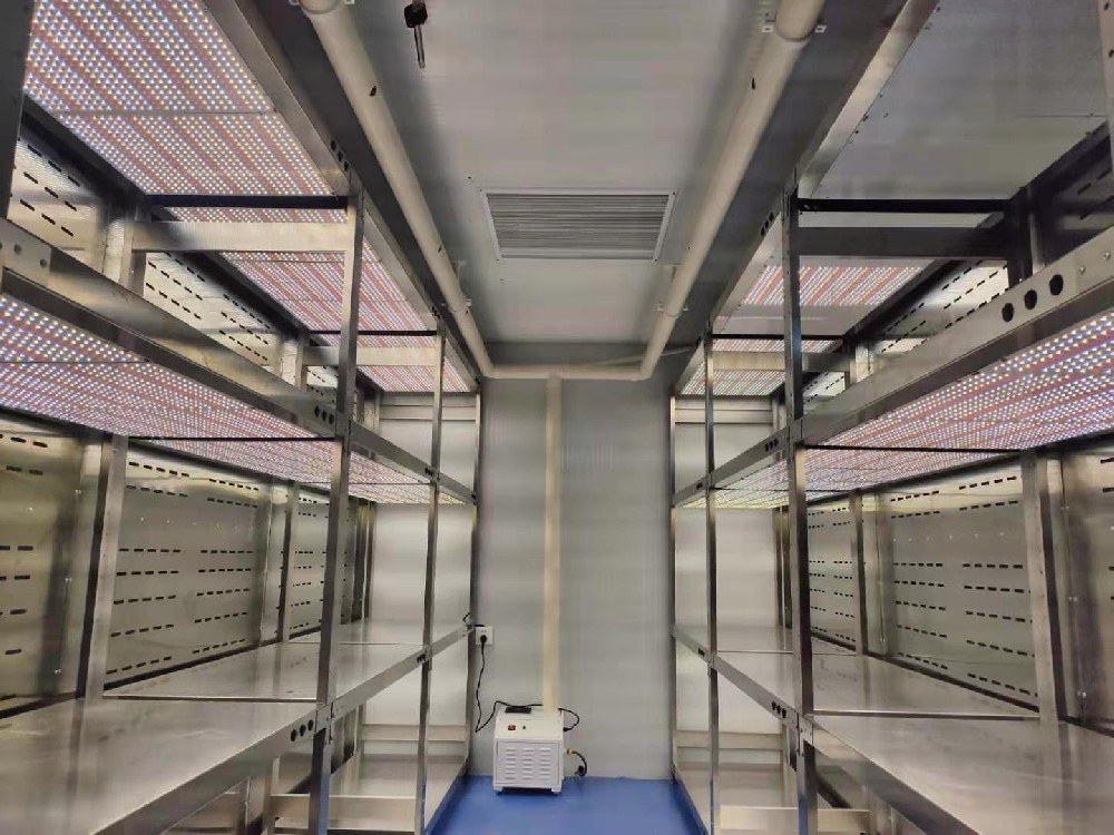 培养架尺寸分别为1.3米(长)*0.6米(宽)*2.0米(高),光照培养架由架子、层板、高效三基色LED平面式光照板、光照控制开关组成。层板是放置接种好的组培苗的场所;层板与光源距离有5CM,可以防止热量上传。顶置高效三基色LED平面式光照板和植物生长荧光灯为植物的生长发育提供适宜的光照;可独立开关主要控制每层光照的开与关。架子立柱采用不锈钢槽钢,横梁可直接插入,层高可调,每层承载重量大于200kg/层。